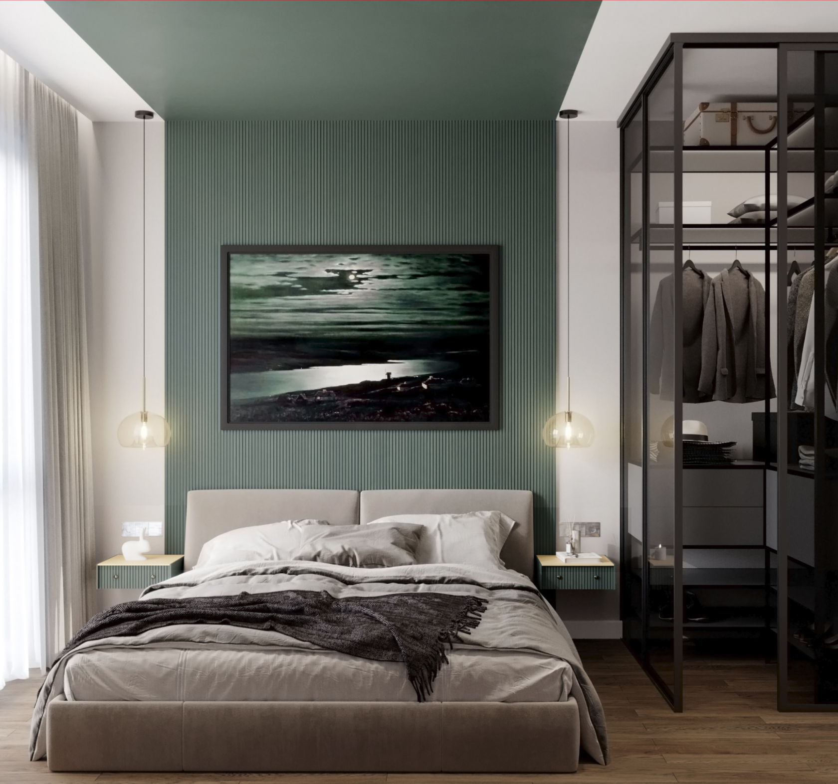 Для отделки всех стен мы использовали краску от бренда Avalon, которую можно мыть пароочистителем. На пол положили паркетную доску по всей квартире. В ванной, прихожей и санузле на полу – крупноформатный керамогранит от Италон, а вот стены стали изюминкой этого проекта, которые теперь просят повторить наши другие клиенты: в ванной стены под покраску в терракотовых оттенках, в сочетании с мелкоформатным керамогранитом изумрудного цвета; в санузле фреска с зайцами, покраска и не реально красивое зеркало в латунной раме. В спальне интересный переход от стены на потолок в тонком оттенке зеленого, в совмещении с дюрополимеровыми панелями.