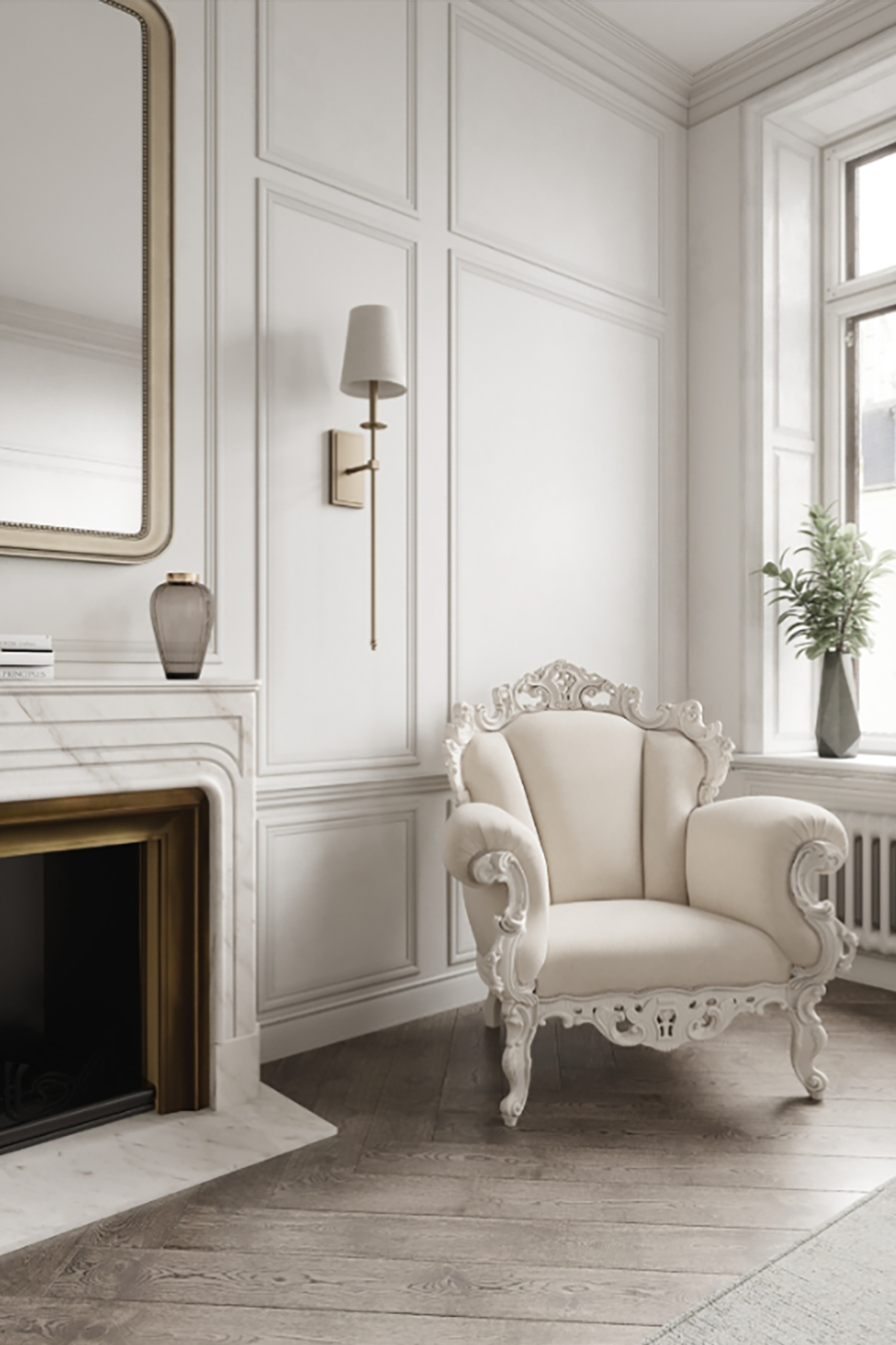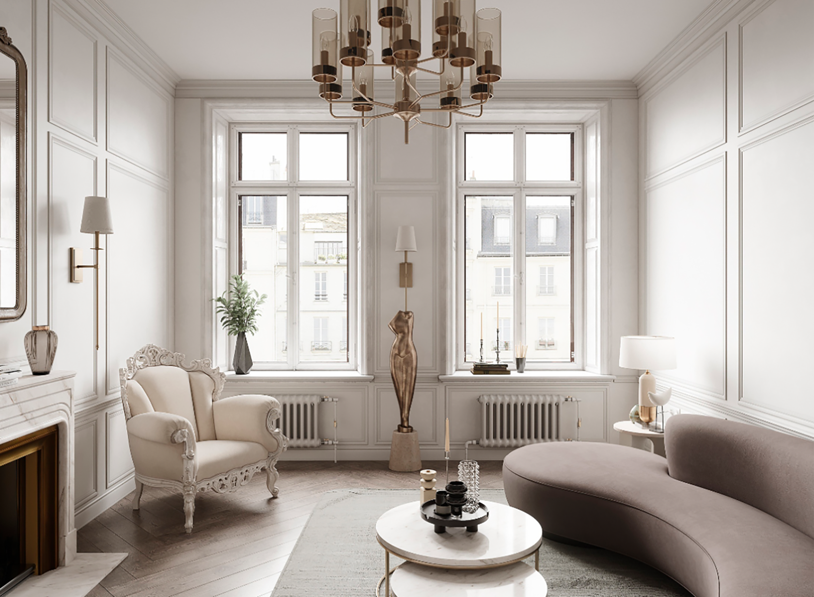 Квартира спроектирована так, что в ней нет ни единой мебели, которая бы была отделена от стилистики или не повторяла геометрию и высоту помещений. Окна в квартире при покупке стояли дубовые в старой эмали, мы решили их сохранить и отреставрировать, добавив интересное преломление света за счет французской сетки. А также были сохранены чугунные батареи 1947г.