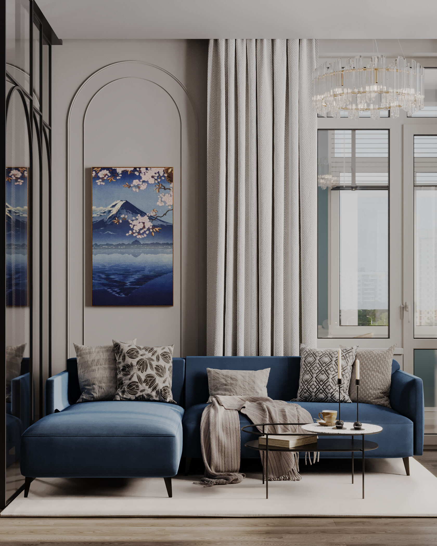 Квартира для состоявшейся пары, с которой проживают две чудесные собаки. Клиентам хотелось просторную спальню со своей гардеробной, гостиную открытого формата и балкон с зоной отдыха. Важно, чтобы квартира выдержала домашних животных