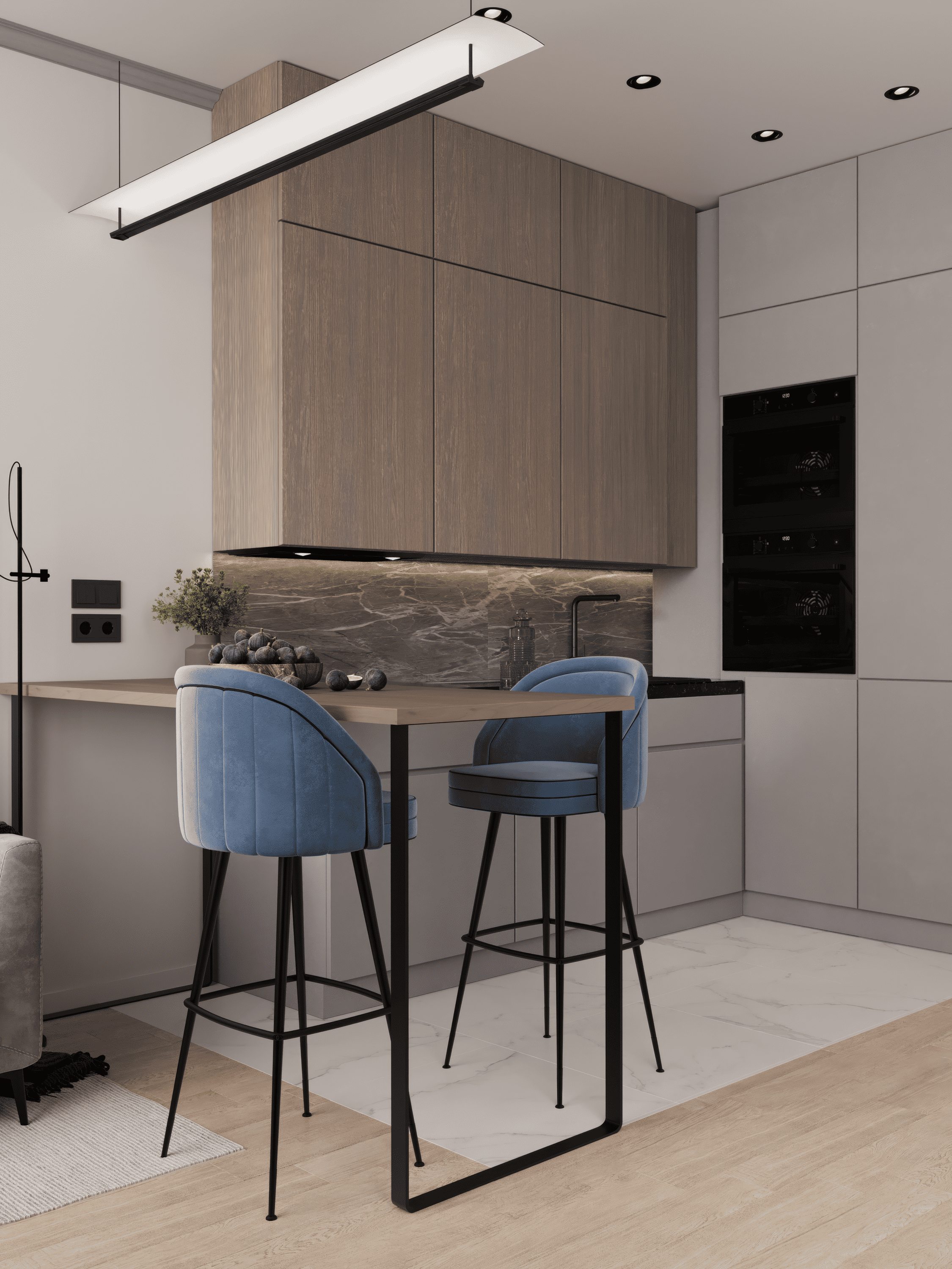 Квартира купленная с отделкой. Квартира для молодого человека 19 лет. Меняем напольное покрытие без капитального ремонта. Нестандартное решение в связи с запросом клиентов, два дивана (два спальных места), но так как площадь достаточно маленькая мы сделали подиум, на котором расположили диван и ниже расположили кровать, которая задвигается в подиум.